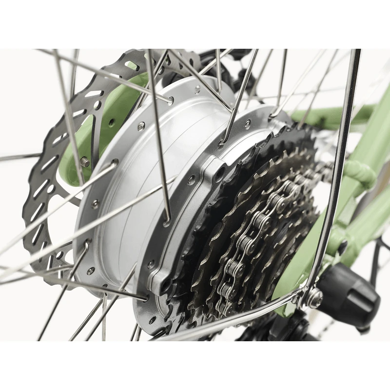 - The Electra E-bike System provides confidence and control through three modes of power support with a rear hub motor and is paired with a 7-speed derailleur for added range. Wider 700x40c tires are complimented by flat mount disc brakes that allow you to stop quickly and safely.