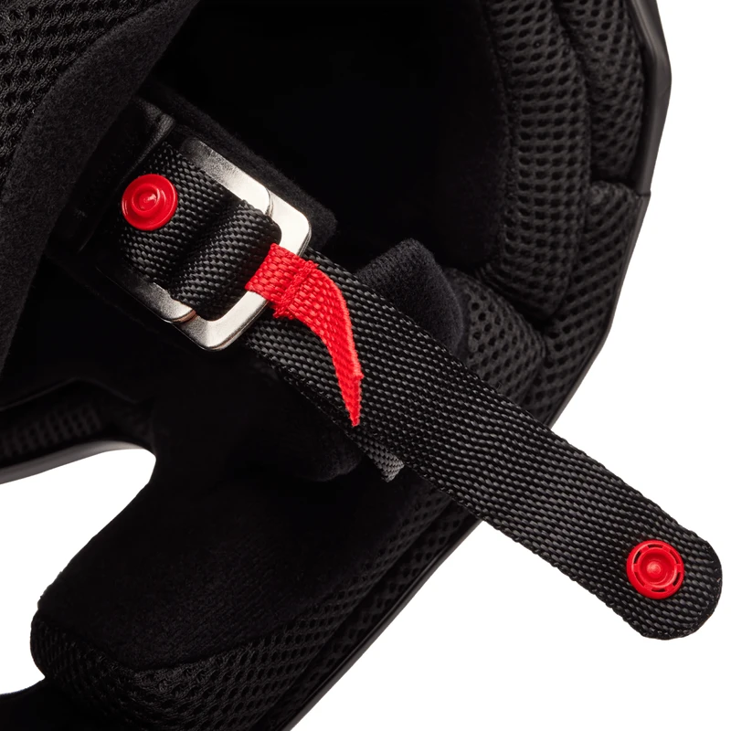 - Steel D-ring chin strap closure
