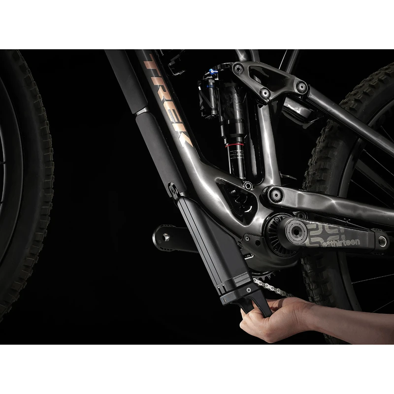 An OCLV Mountain Carbon frame equipped with a fully-encased 360Wh battery and TQ harmonic pin ring transmission with a smart charging port, integrated LED display, and discreet handlebar remote. Plus, a 150mm RockShox Lyrik Select+ fork with DebonAir spring and Charger 2.1 RC damper, and 140mm RockShox Super Deluxe Select+ rear suspension. All wrapped up with the precise shifting and modulation of a Shimano XT drivetrain.